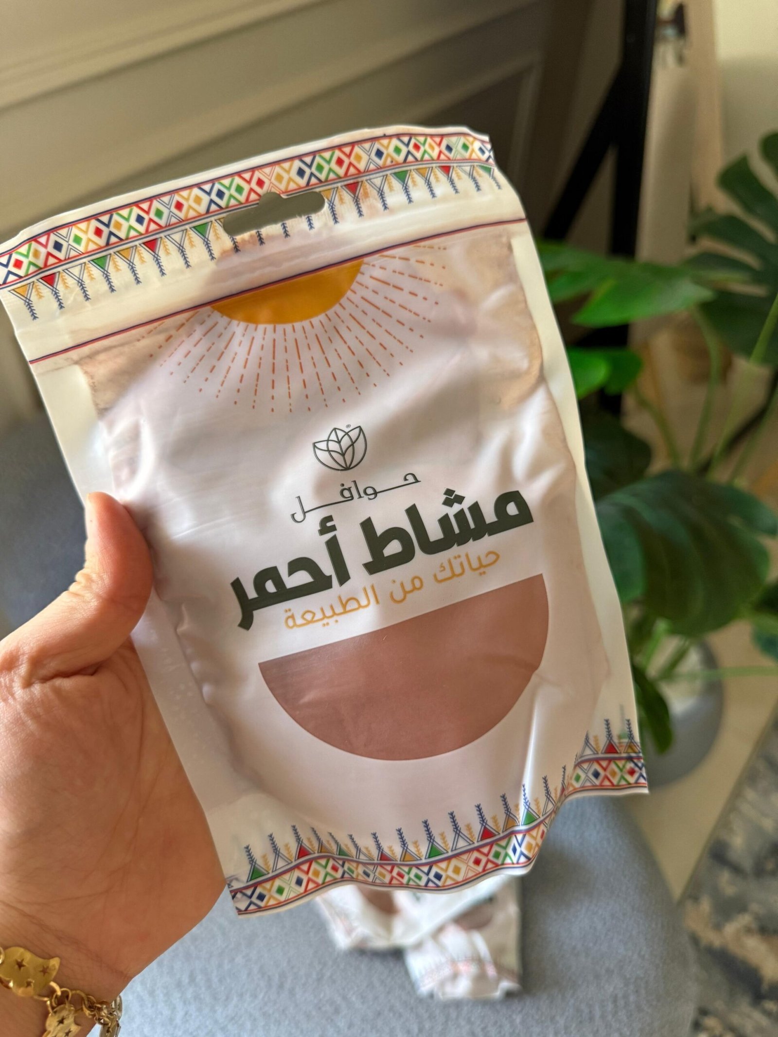 يستمد المشاط لونه الأحمر المميز من الكركديه، بينما تتضمن تركيبته أعشاباً أخرى قوية المفعول: