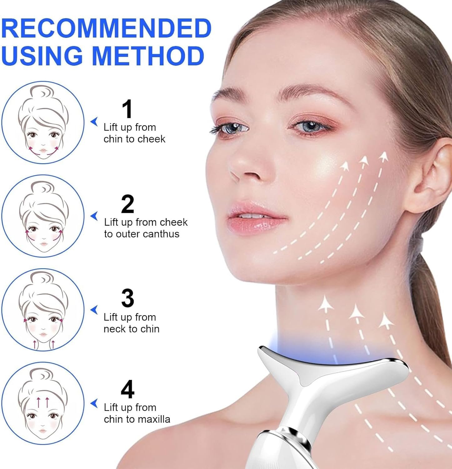 Better Absorption: Neck lifting massage device adopted high frequency vibration to lift and tighten skin, make skin better absorb the nutrients in the skin care products. Fade Fine Line: Neck firming machine can deep heating collagen cells, promote collagen fiber and elastic fiber regeneration, which can fading fine lines. Vibration Massage: Face neck massage device has 3 vibration modes to remove wrinkles and bright skin color, which can effective keep skin healthy and young. For All Skin: Neck face firming machine has mode memory function, with USB charging interface, which is safe and convenient to use, suitable for any skin type. 3 Color Light: Neck beauty instrument with 3 colors photoacoustic mode, which can directly to the bottom of the skin, and improve skin quality.​