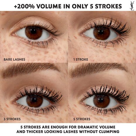 Lash Clash Extreme Volume Mascara adds highly pigmented black or brown color and 200% more volume with up to 24-hour smudgeproof wear. The massive Double Conical Brush coats all lashes and holds maximal formula for high volume in just one swipe. The formula lets you wear any level of volume from one to five strokes. Lash Clash is outfitted in sleek Yves Saint Laurent packaging to become the ultimate luxury must-have.